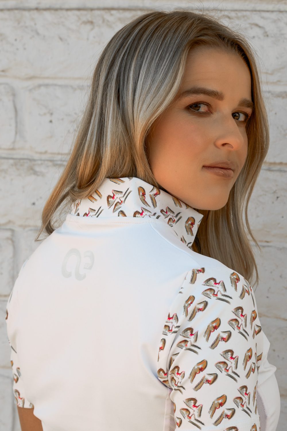 Our latest collaboration with world renown equestrian artist Donna Bernstein, the American Equus "HoofBeats" Short Sleeve Sun Shirt is a beautiful blend of Donna's artwork and our performance technical equestrian wear. Our sun shirts are a comfortable and stylish addition to your every day riding outfit of the day.