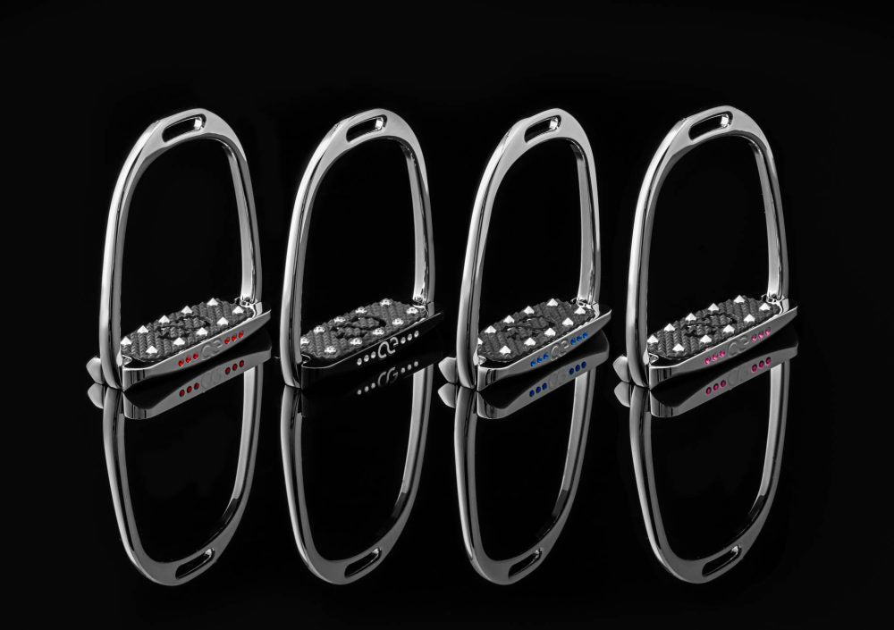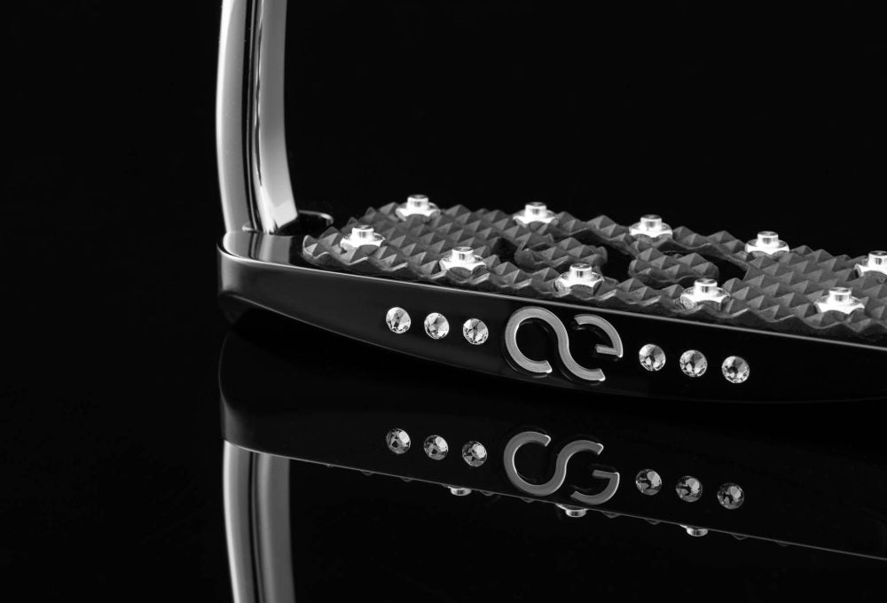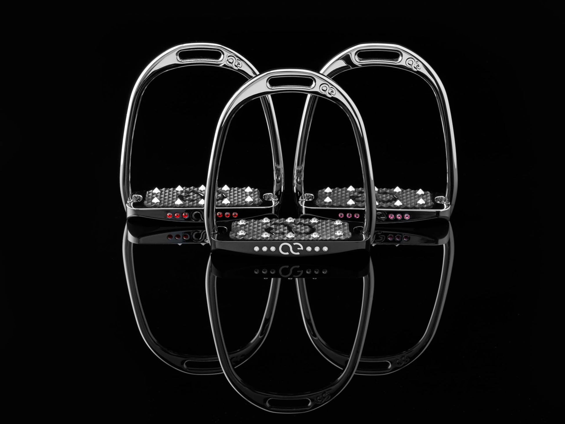 Each stirrup is hand-polished to a mirror like surface then custom Powder Coated for a luxurious, durable and lustrous finish. For the final touch each pair stirrups is hand adorned with 7 Swarovski Crystals in your choice of one of three colors. These adornments will add that further touch of exquisite elegance.