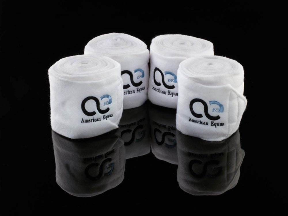 Our Polo wraps are bandage materials, made of the finest fleece, for your horse's legs. Use them to make a beautiful and bold statement as you protect your horse's legs during ridden work, longing, and turnout. Our Signature Logo Polo wraps can be used for many tasks and disciplines and have been approved to be used in the jumpers and equitation divisions. Our Signature Logo Polo wraps protect against minor scrapes and bruises and help prevent irritation from sand or arena footing and are crafted from the finest fleece material and are available in either black or white.