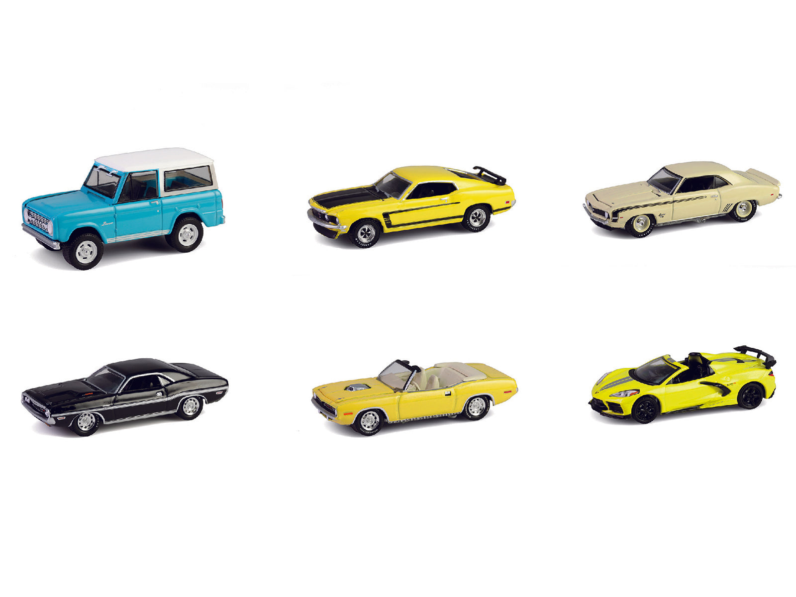 - 6) 1969 Ford Mustang Boss 302 Bright Yellow with Black Hood and Stripes.