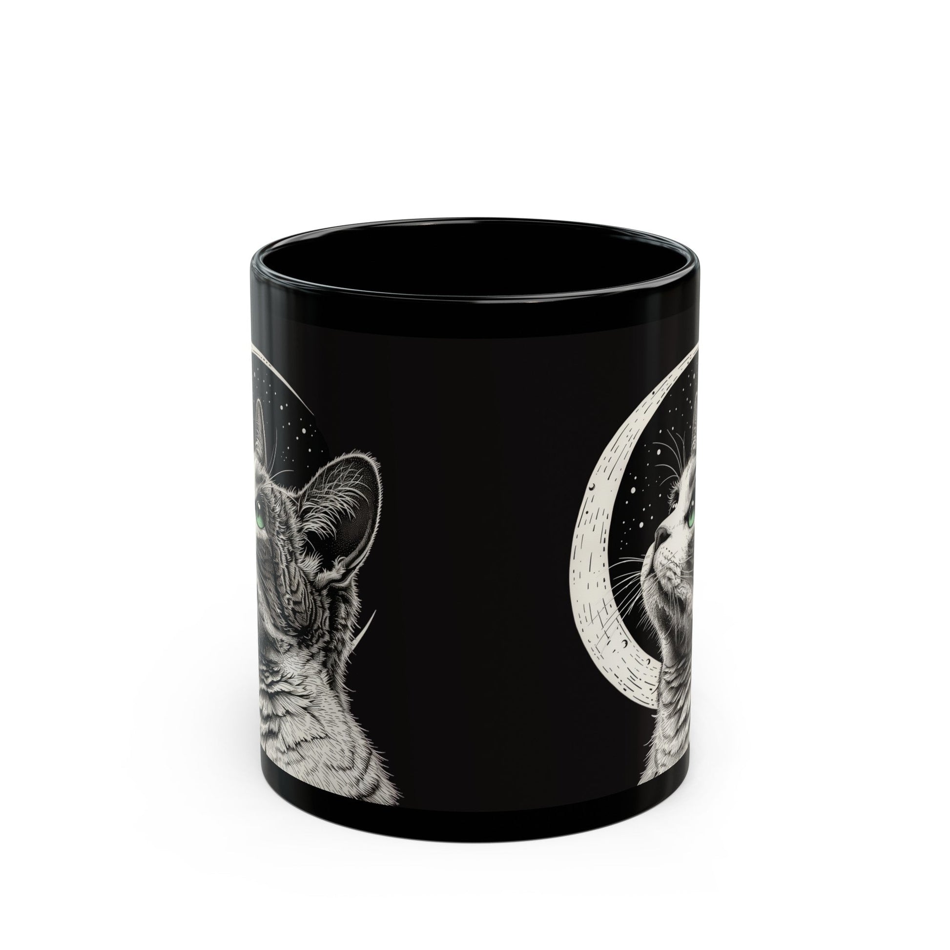 Crescent Moon Cat Black Coffee Tea Mug - the perfect companion for your morning cup of coffee, tea or hot chocolate. Crafted from high-quality, durable ceramic, this classic black mug is designed to withstand daily use and is sure to become your go-to mug for all your favorite hot beverages. With its sleek and stylish design, this mug is perfect for both home and office use.