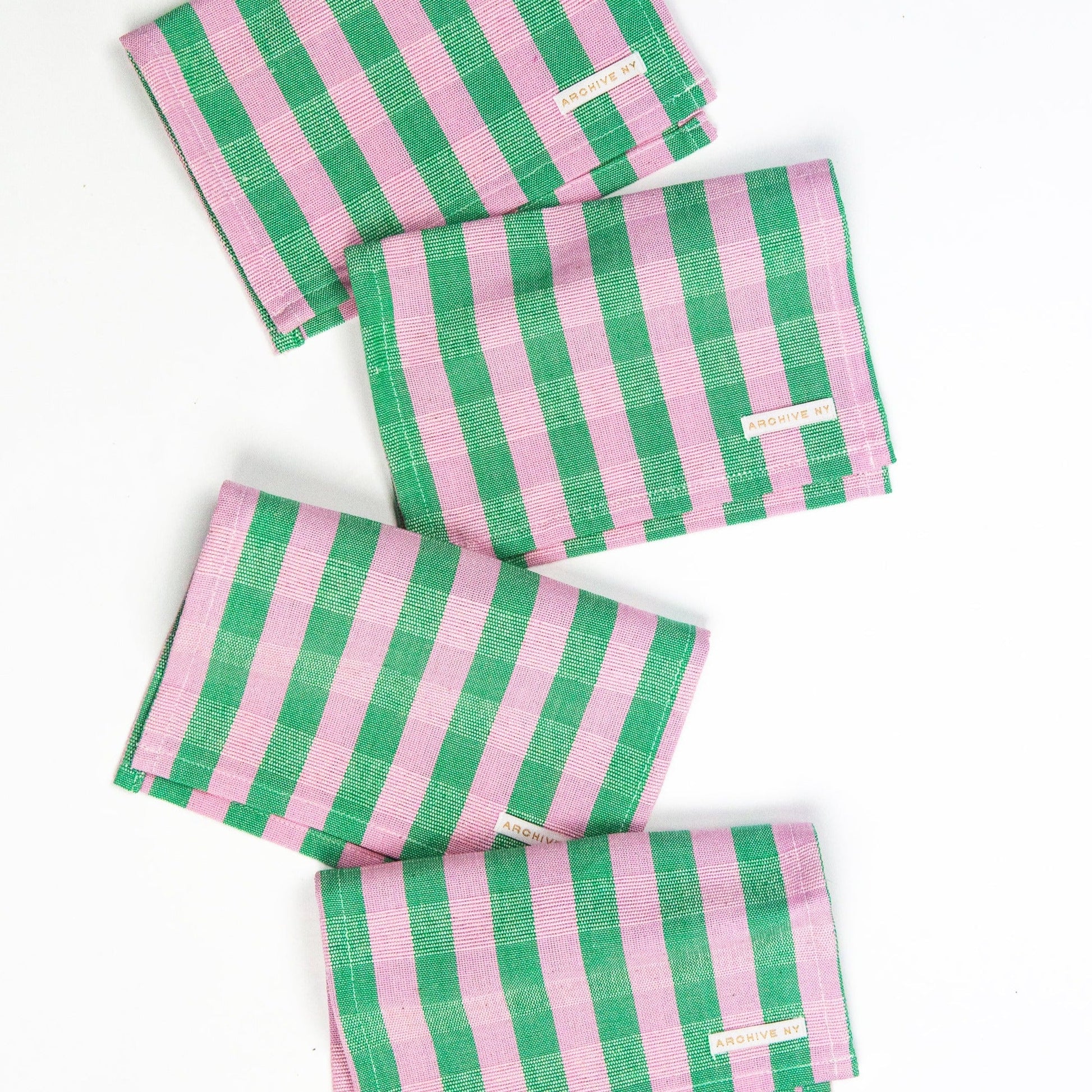 The Flora striped napkins are the perfect accent to add color and texture to any table setting. Stripes of light pink and kelly green are woven together to create this boldly colorful textile.