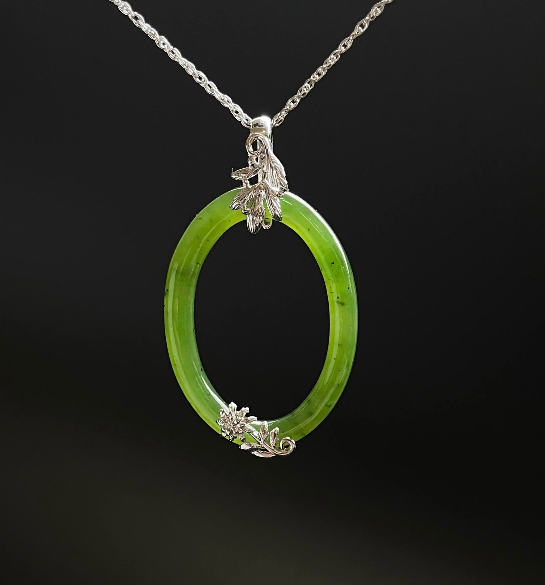 Canadian Nephrite Jade Oval Pendant, set with sterling silver leaves and a flower.