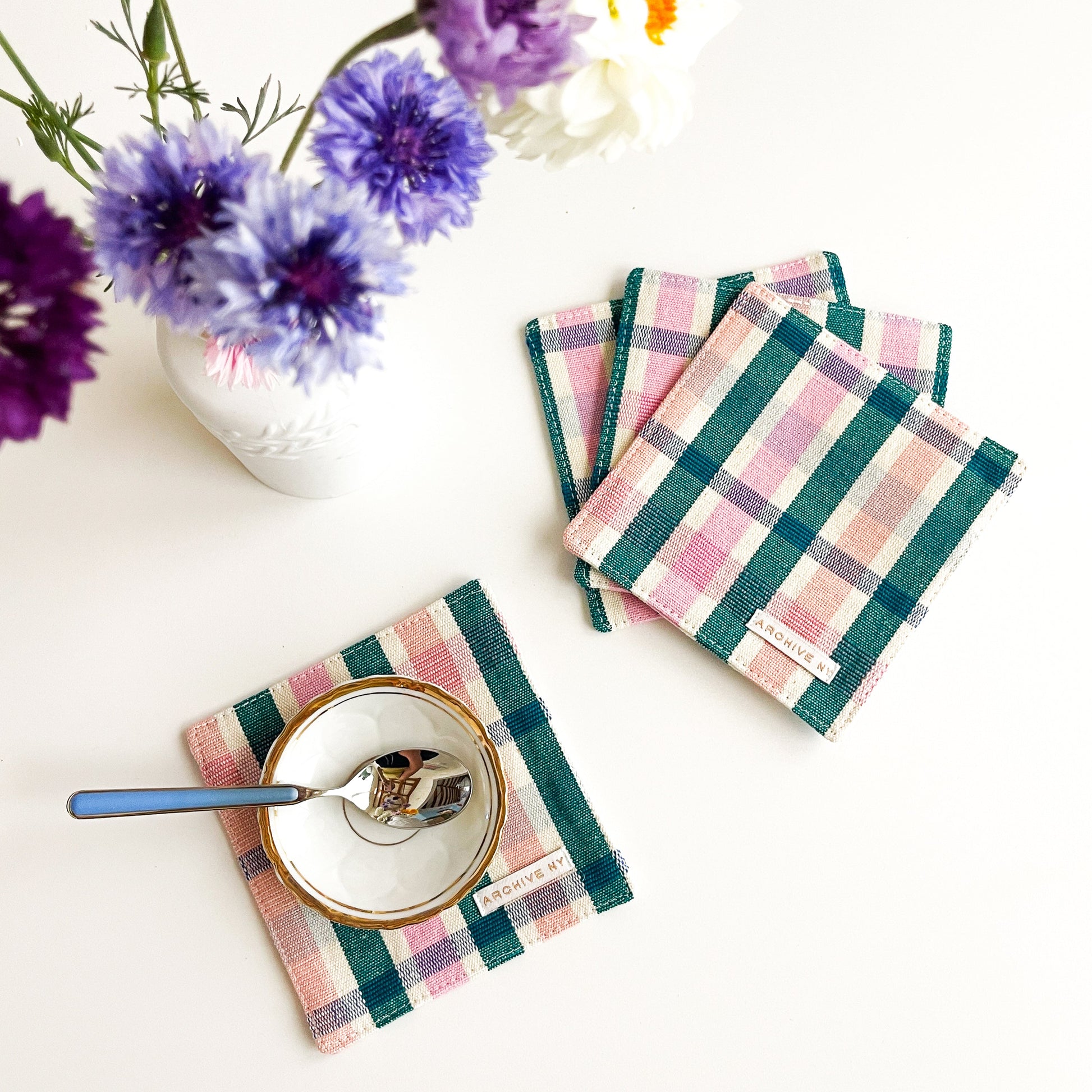 Both practical and pretty, our Lola plaid coaster set will be a lively addition of color to any table setting. A stripes of light pink, peach, emerald, and royal blue are woven together to create this brilliantly colorful piece. Ethically handwoven by artisans in Xela, Guatemala. Sold in a set of 4.