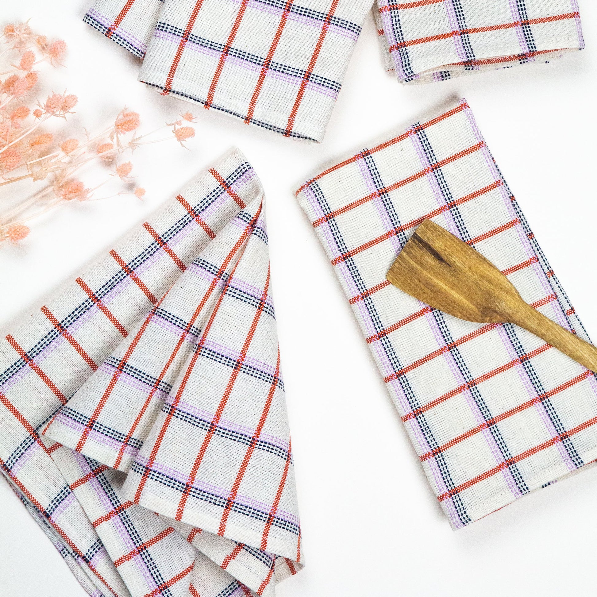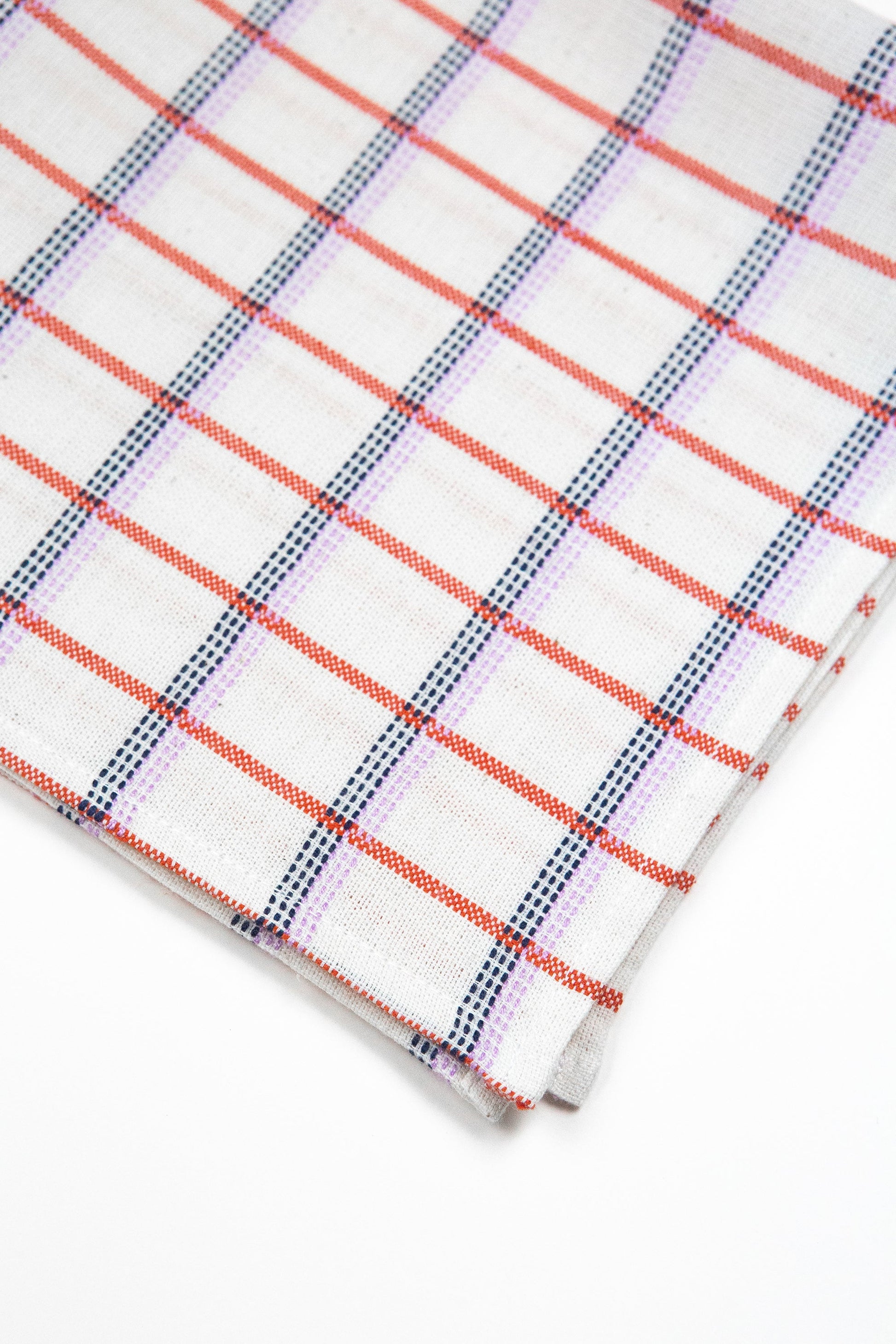 Ivory white plaid napkin, ethically handwoven by artisans in Chiapas, Mexico on traditional footlooms. With hints of orange and lilac, this updated classic plaid will be a lively addition to any table setting or dinner party. Sold individually, or enjoy our discount on a set of 4.