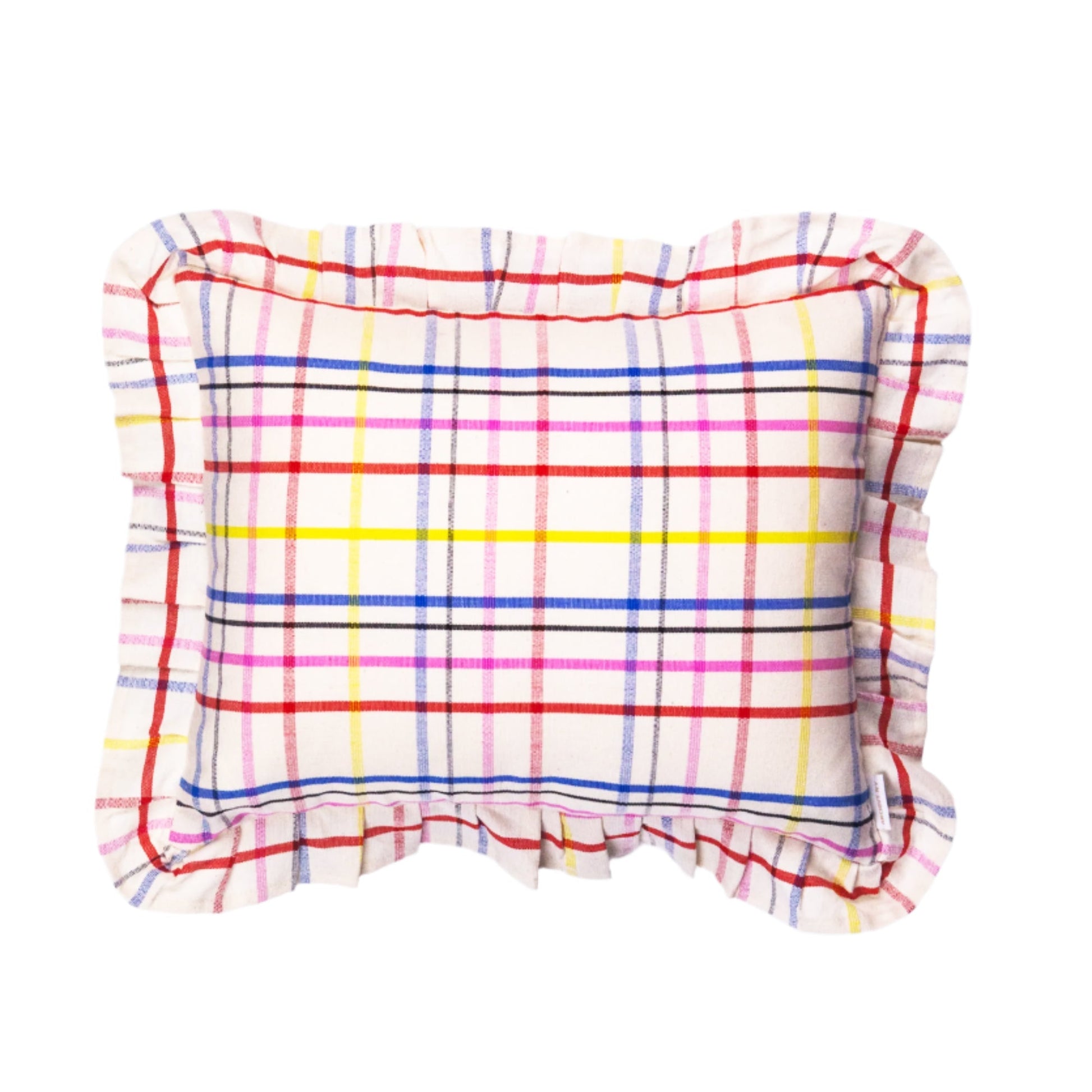 Our Vera plaid ruffle pillow is the perfect accent to add soft color and texture to any sofa, bedroom or accent chair. Bubblegum pink, royal blue, Red and yellow are woven together to create this brilliantly colorful plaid. Ethically handwoven by artisans in Xela, Guatemala.