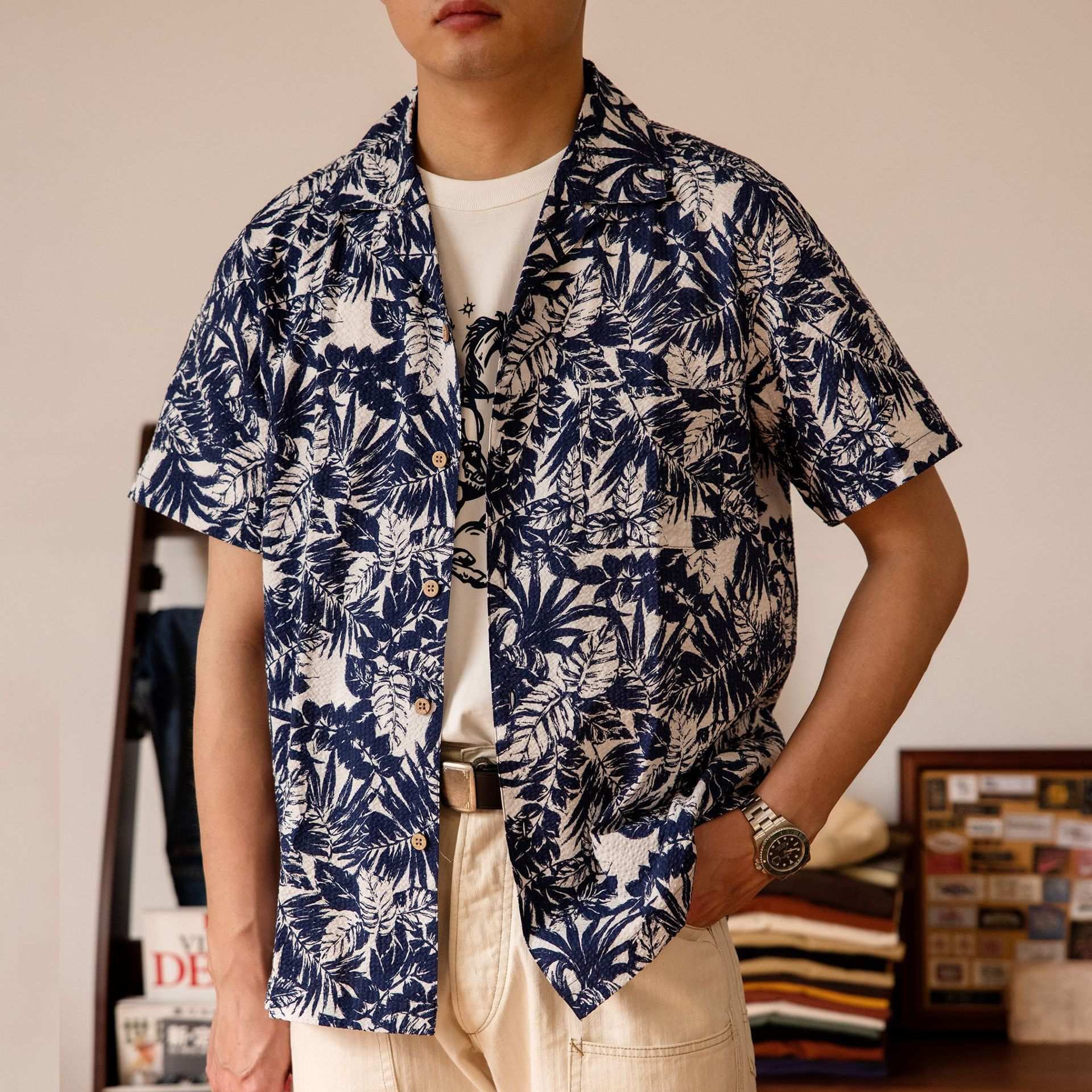 Vintage Printed Seersucker Cuban Collar Shirt