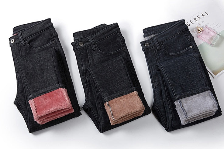 Women Thermal Jeans Winter Snow Warm Plush Stretch Jeans Lady Skinny Thicken Fleece Denim Long Pants Retro Blue Pencil Trousers