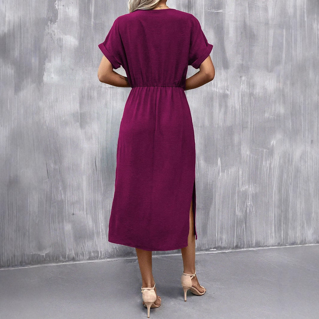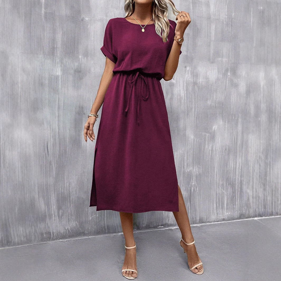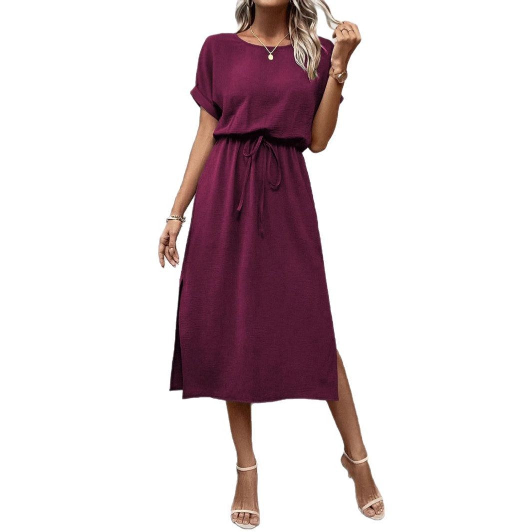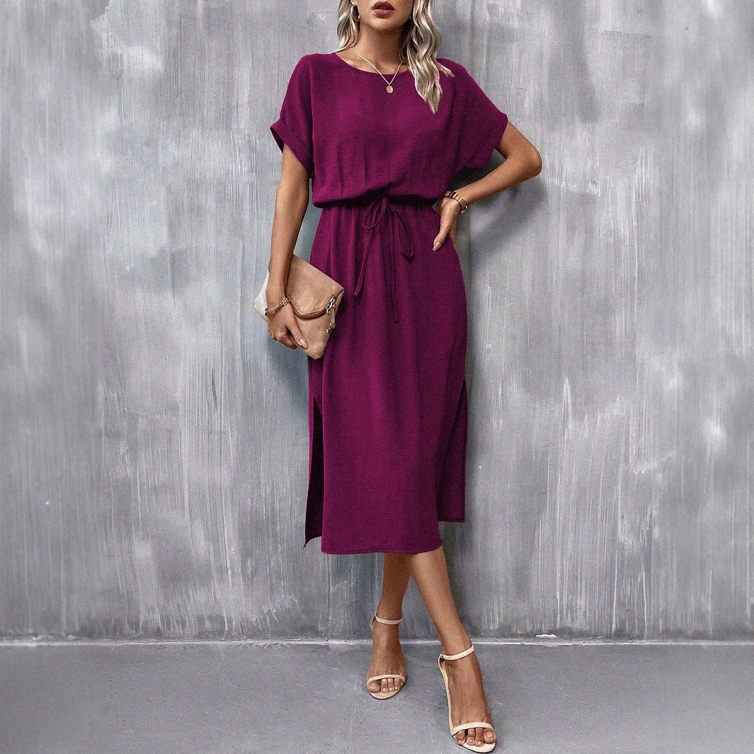 Women's Solid Color Reverse Sleeve Flat Short Sleeve Crew Neck Split Dress