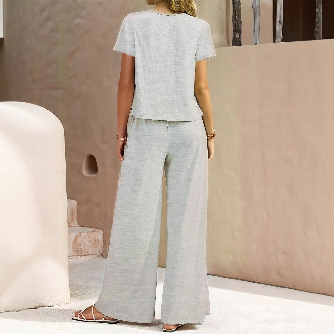 Women's Summer Fashion Solid Color Round Neck Top Paired With Casual Wide Leg Pants Set