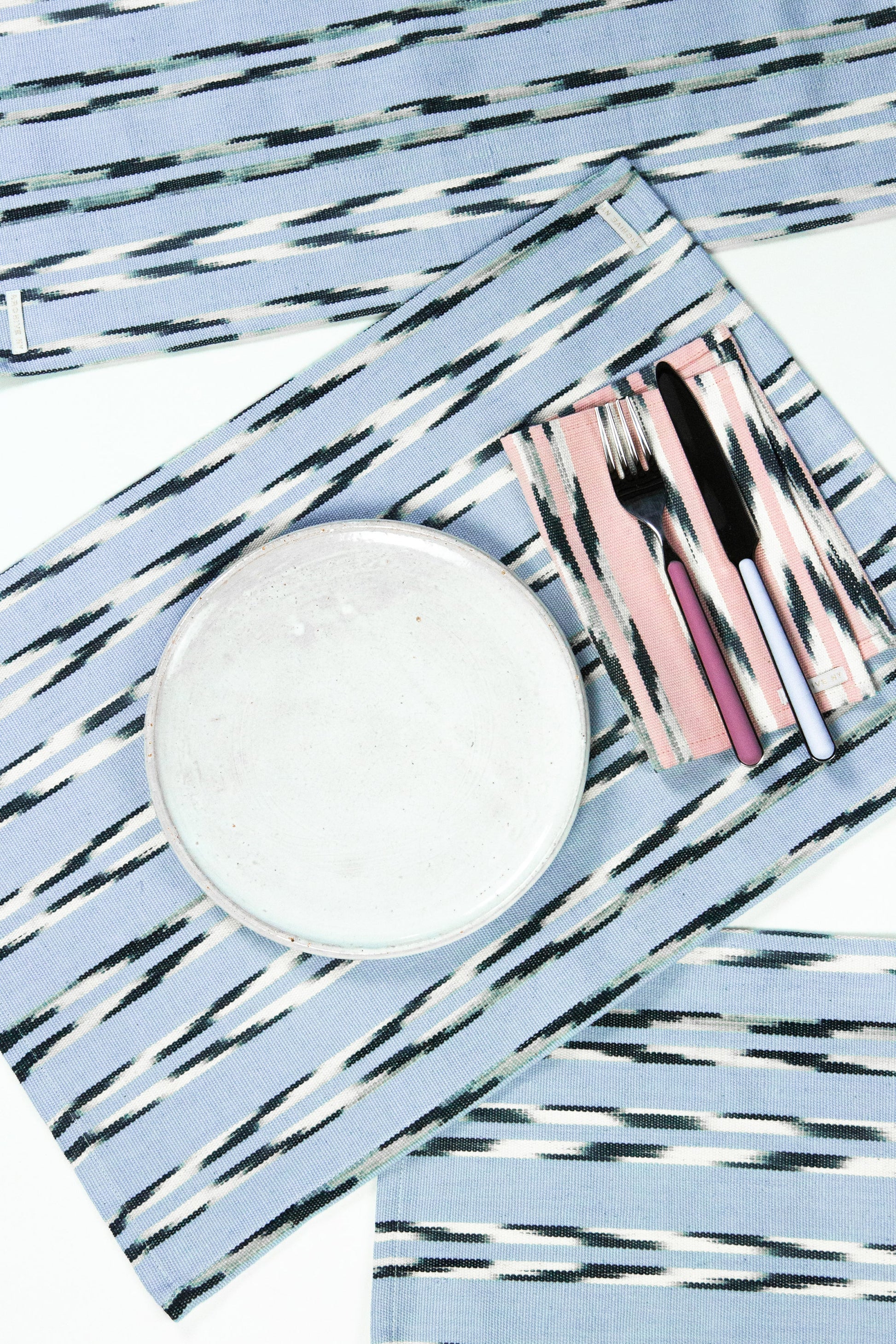 These placemats were woven in Guatemala by artisans on traditional footlooms, these napkins feature an intricate Guatemalan tie dye technique jaspe that creates the stunning grey and white pattern running through this textile. Hand crafted and ethically made.