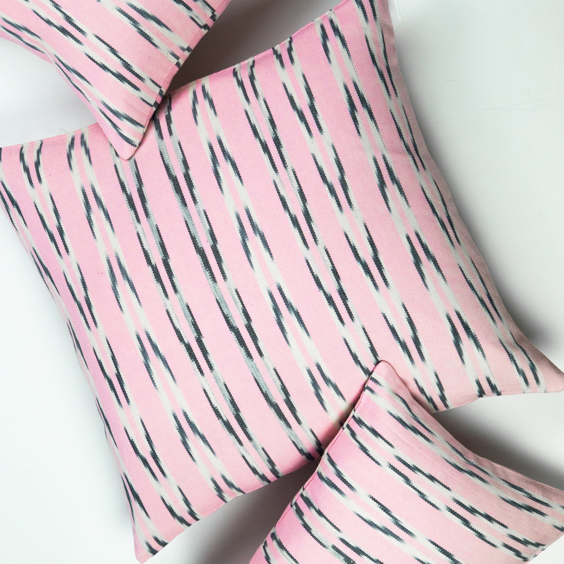 This light pink pillow was woven in Guatemala by artisans on traditional footlooms featuring an intricate Guatemalan tie dye technique jaspe that creates the stunning grey and white pattern running through this textile. Hand crafted and ethically made.