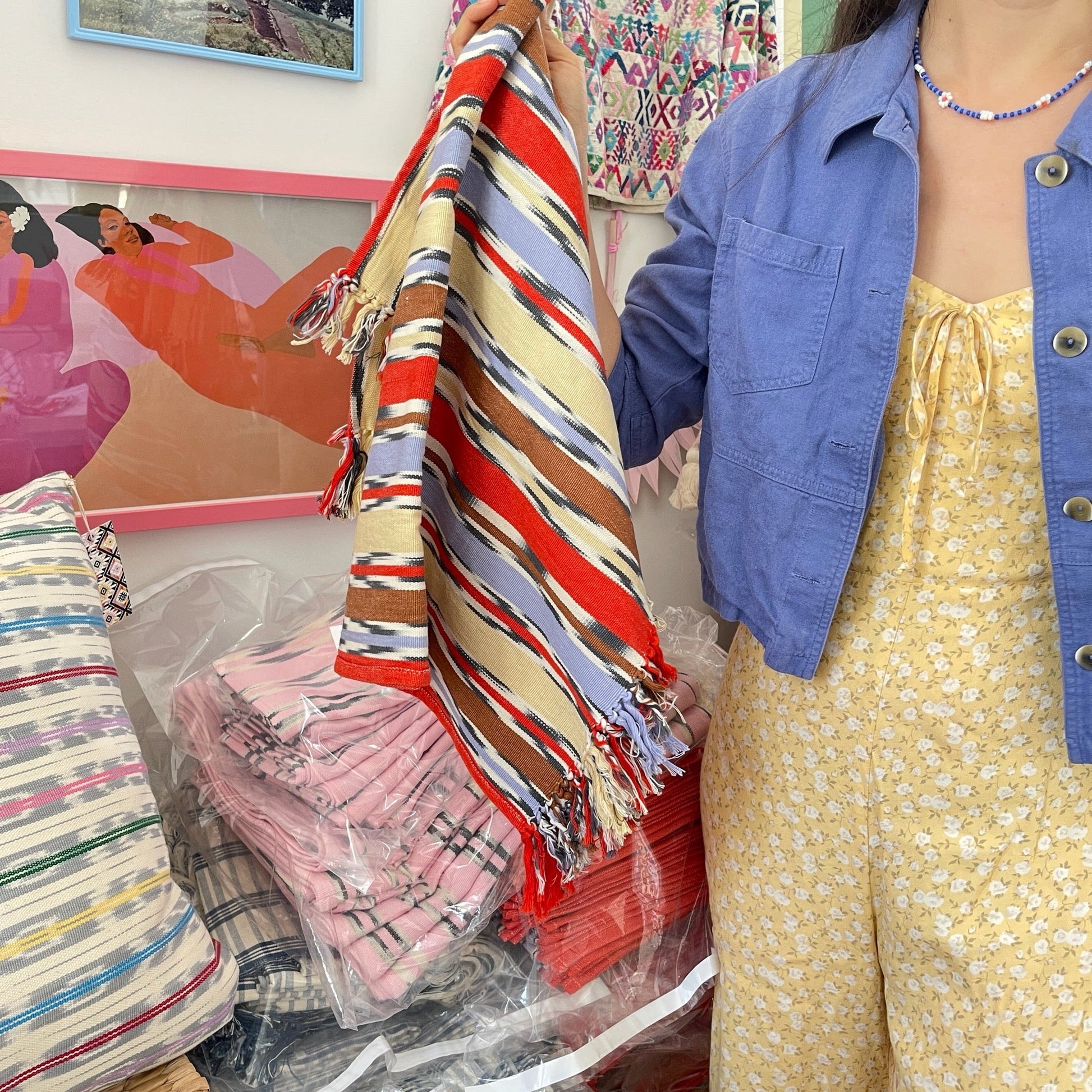 This multi color tea towel was woven in Guatemala by artisans on traditional footlooms featuring an intricate Guatemalan tie dye technique jaspe that creates the stunning grey and white pattern running through this textile. Hand crafted and ethically made.