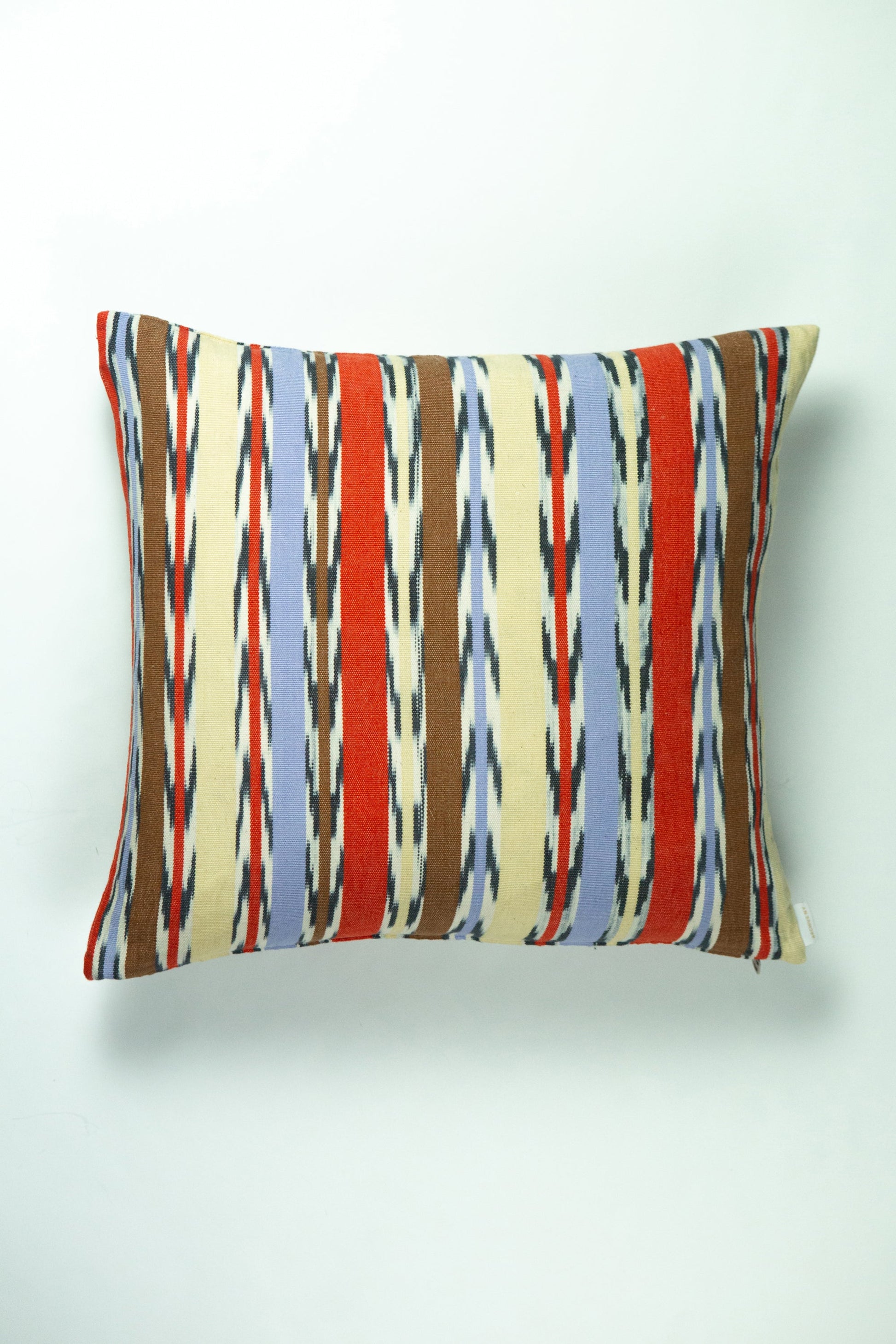 This multicolor pillow was woven in Guatemala by artisans on traditional footlooms featuring an intricate Guatemalan tie dye technique jaspe that creates the stunning grey and white pattern running through this textile. Hand crafted and ethically made.