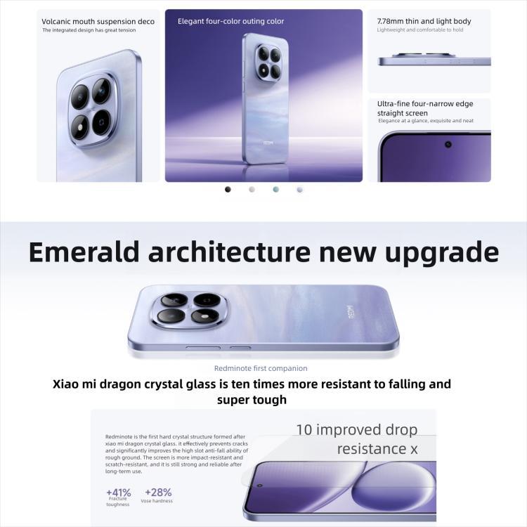 Specifications: 1. CPU: Dimensity 7400-Ultra, octa core, 4nm, up to 2.6GHz; GPU: Mali-G615 MC2 2. Memory Capacity: 8GB+256GB 3. Operating System: Xiaomi HyperOS 2 4. Sensors: Ultrasonic distance sensor, ambient light sensor, electronic compass, accelerometer, gyroscope, infrared remote control, X-axis linear motor 5. Languages: English, Simple Chinese, Traditional Chinese 6. SIM card slot: Dual Nano-SIM card slot 7. Charging Interface: Type-C 8. Battery: 7000mAh non-removable battery 9. Charging Power: 45W wired fast charging, 22.5W wired reverse charging 10. Size: 163.61 x 78.09 x 7.78mm 11. Weight: 210g Screen Display: 1. Screen: 6.83 inch, 2772 x 1280 2. Display frame rate: 120Hz 3. Touch sampling rate: 480Hz-2560Hz Cameras: 1. Rear Camera: 50MP (f1.5, LYT-600) + 8MP 2. Front Camera: 20MP Network Band: 1. 5G: N1/N3/N5/N8/N28a/N38/N40/N41/N48/N77/N78 2. 4G: FDD-LTE: B1/B3/B5/B8/B19/B28A; TDD-LTE: B34/B38/B39/B40/B41/B42/B48 3. 3G WCDMA: B1/B5/B6/B8/B19 4. 2G GSM: GSM850/900/1800MHz Wireless Network: 1. WiFi Protocols: Wi-Fi 6, Wi-Fi 5, Wi-Fi 4,802.11a/b/g, 2.4GHz / 5GHz 2. BT: BT5.4 3. GPS: Beidou, GPS, Galileo, GLONASS, QZSS, A-GPS 4. NFC: Support Package List: 1. Phone x 1 2. Eject Pin x 1 3. Protective Case x 1 4. USB Cable x 1 5. US Plug Charging Adapter x 1 6. Pre-attached Protective Film x 1 7. Package Box x 1 (The actual product shall prevail)